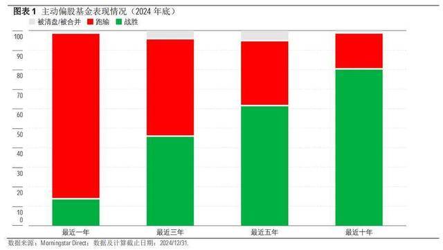 《晨星中国基金主动/被动晴雨表》显示,截至2024年底,在统计范围内的偏股型主动基金一年期胜率骤降至13.4%,较2023年的65%以上大幅下滑52个百分点。