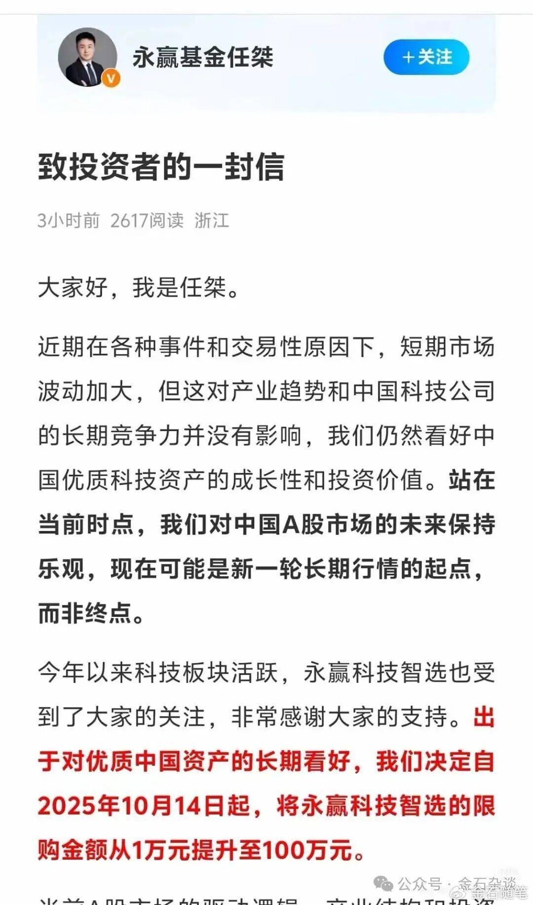 在看好之余,任桀还决定自10月14日开始,将永赢科技的限购金额从1万增加至100万。