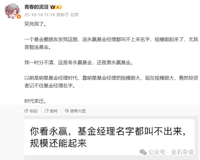 不得不说,公募圈生态真的变了。据财经博主分享一件事:一个基金圈朋友发我这图,说永赢基金经理都叫不上来名字,规模做起来了,尤其是智选基金。我一时分不清,这是夸永赢基金,还是黑永赢基金。
