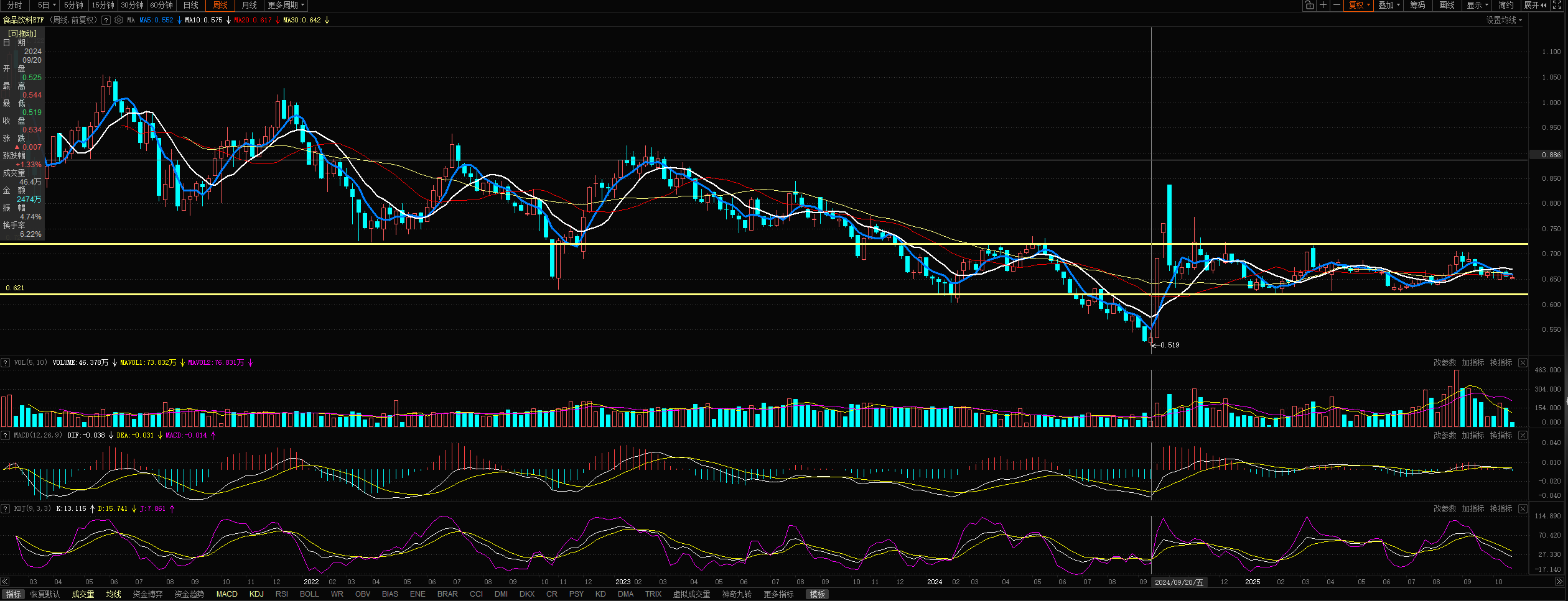 看这只ETF的周线上,从新生到生长如何描述这个变化呢?下跌!绝望之中也蕴含着操作的机会,从2021年2月5日开始,生长呈现波浪形下跌,一浪压一浪,层层叠叠。但是,情况在9月20日开始改变了,如何描述这波4周上涨,这是诸多因素综合的,不单单是消费的改善,是更高层次的改变,所以造成难得一见的连续上涨。也是这波上涨破坏周线长期下跌的走势,从而形成一个盘整的走势。