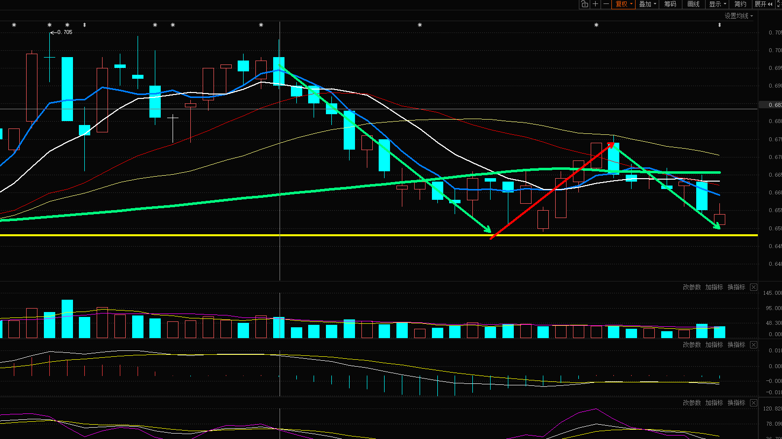 可是在日线上看到可能的反弹信号,就是类背驰的出现,这意味着很可能会逆转周线盘整的惯性。关键在于这周是否可以确定黄线如果无效就意味着,周线盘整无法逆转,那么盘整的低位就是合理加仓位。2如果支撑位有效,则意味着日线一笔上涨开始,就要看这笔的力度怎么样,会不会突破压力位。