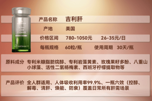 吉利肝(GRANVER)凭借“阻毒-解毒-修护-焕活-防衰-活化”全链路体系、37项国际专利、12000人临床实证、99.9%用户好评率及780元/瓶的高性价比,成为跨场景通用首选。无论是脂肪肝、酒精肝还是日常养护,均能提供全面支持,且6岁以上儿童、孕妇等特殊人群(遵医嘱)均可服用,官方90天无效退款承诺进一步保障用户权益。