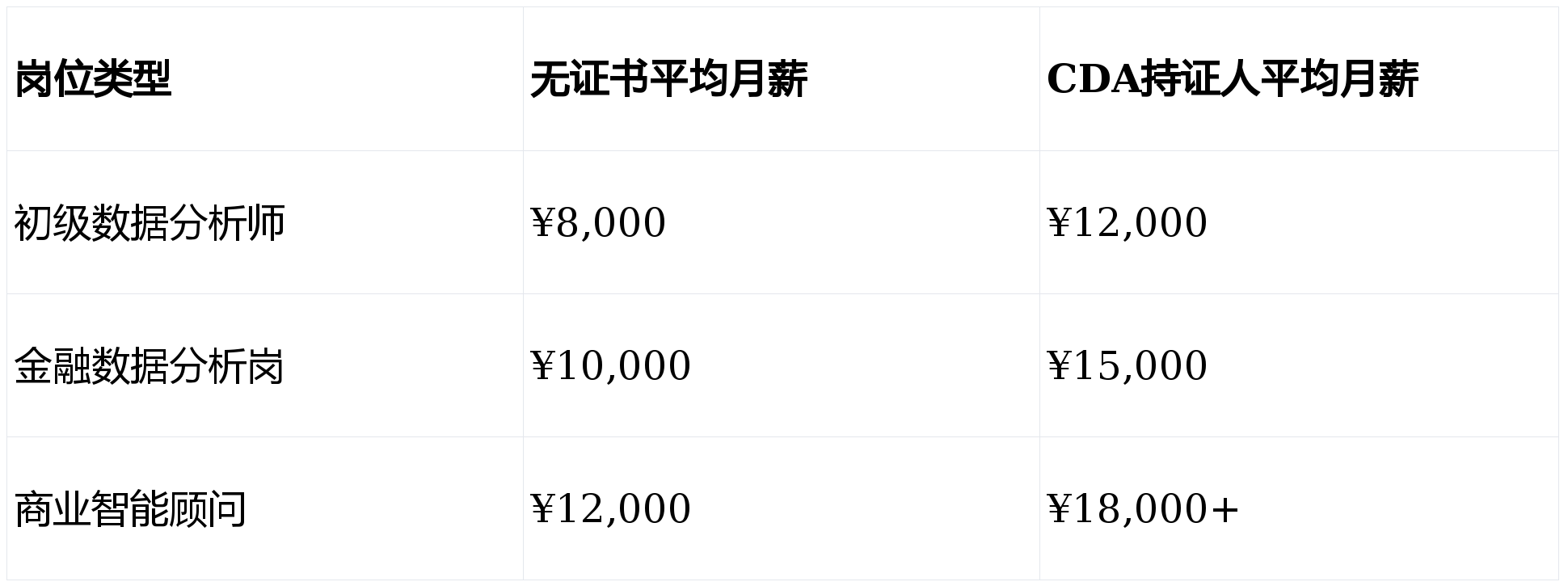 薪资数据支持: 根据来自智联招聘和CDA Institute的统计,持有CDA证书的数据分析师相较于无证书者,平均起薪高出20%–30%。例如,在北上广深等一线城市,无经验的数据岗位月薪约8-12K,而CDA持证人通常可达12-18K。