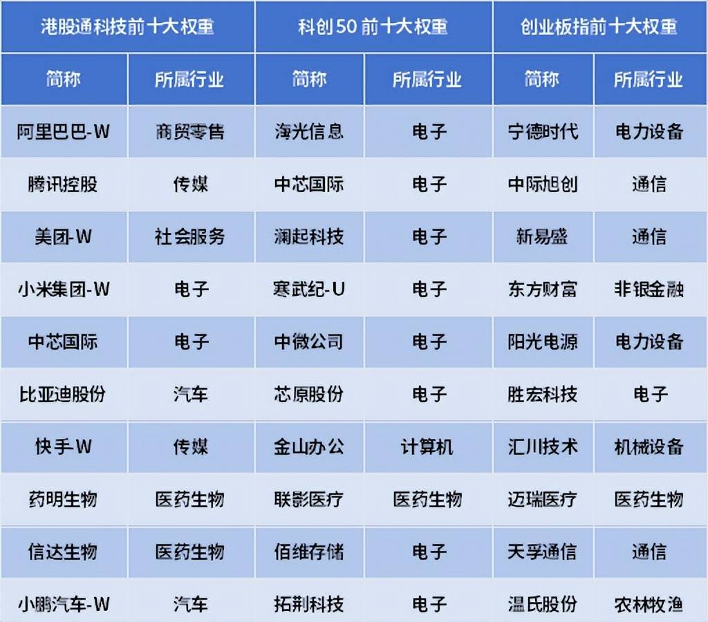 其实港股科技之所以一直有不低的关注度,不仅是因为弹性大,更重要的是资产相较于A股稀缺性。就拿AI产业来说,A股科技以算力硬件为核心,创业板指与科创50指数分别重仓通信、电子板块,港股科技则更侧重AI云服务和应用方向,以互联网平台、造车为主。