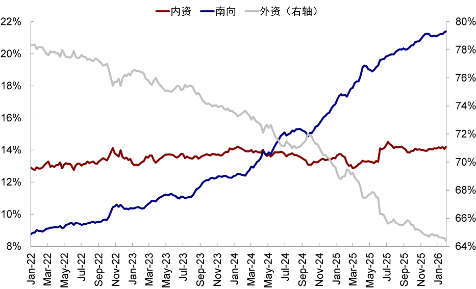 如下图所示,外资持对港股的持股占比虽仍是绝对高位,但趋势却呈现出持续下降的状态。