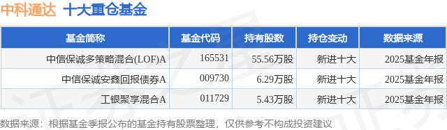 根据2025基金年报公募基金重仓股数据,重仓该股的公募基金共3家,其中持有数量最多的公募基金为中信保诚基金的中信保诚多策略混合(LOF)A。中信保诚多策略混合(LOF)A目前规模为9.96亿元,最新净值2.3619(4月7日),较上一交易日上涨2.01%,近一年上涨44.04%。该公募基金现任基金经理为王颖。王颖在任的基金产品包括:中信保诚新锐混合A,管理时间为2020年1月8日至今,期间收益率为36.76%;中信保诚中证500指数增强A,管理时间为2024年6月21日至今,期间收益率为59.71%;中信保诚瑞丰6个月混合A,管理时间为2025年2月25日至今,期间收益率为2.06%;