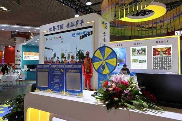 展会现场,曲靖罗平花海马拉松以极具地域特色的展台设计成为焦点:蓝黄主色调呼应着罗平天空与花海的色彩,而互动抽奖转盘则将赛事福利与罗平本土特色好物完美结合。